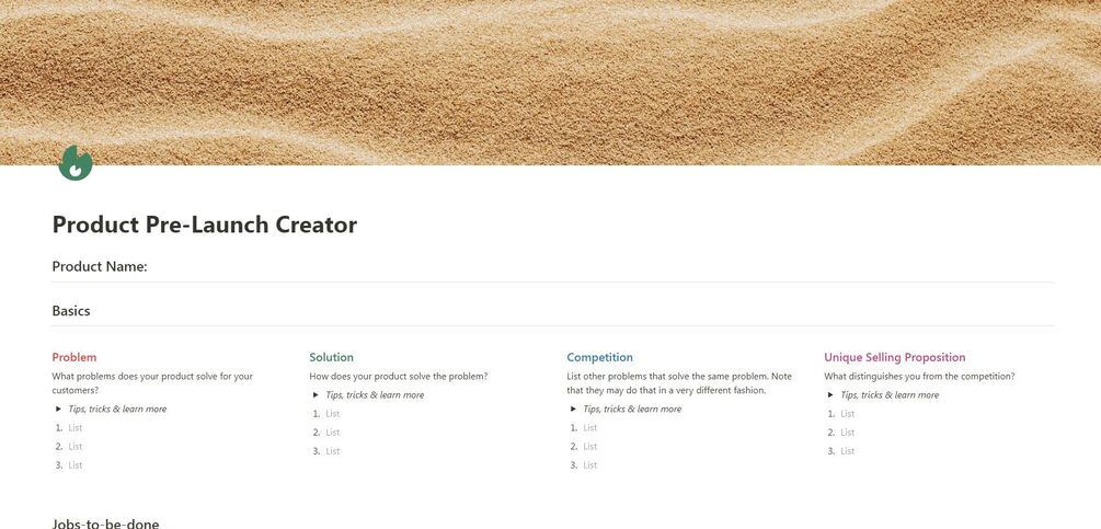 A structured way to establish a good product using the power of notion. Set up the basics, answer the right questions and use our task structure to help you along the way. Enjoy using the right calendar for the job. Organize feedback. Make a plan you can actually stick to.
